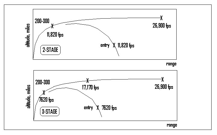 The final trajectories are compared in Figure 4. Both the 2-stage and 3-stage vehicles follow similar paths to the same orbital insertion conditions, at the same altitude (in the vicinity of 200-300 miles, or 300-500 km, up). Only potential re-use of the first stage was considered, for either configuration. A first stage fallback is indicated for each. Reentry velocity is simply assumed the same as the first stage burnout velocity. They would be comparable, in any event. Noting that reentry gets really challenging much above 10,000 feet/second (near Mach 10), I see little point to trying to make the second stage of the 3-stage vehicle reusable. It simply comes back too fast to be readily survivable.