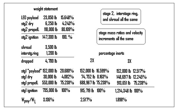 Now, 1 – fprop is the total of the inert mass fraction and the stage payload mass fraction, where the first stage payload comprises the ready-to-ignite second stage, the interstage ring, and the payload shroud. I looked at the baseline, twice, and three times the first stage inert weight fraction, scaling up the first stage ignition weight to match. The resulting weight statements are given in Figure 2. Bear in mind that the delivered stage performance data are identical to baseline, since the mass fractions are identical to baseline.