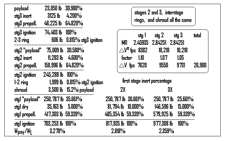 The payload is exactly the same as baseline at 23,050 lb. I assumed the payload shroud weight to be proportional to the maximum payload weight it contains at 15.18%, for 3500 lb. There are no changes to the second or third stage weight statements or performance values as I changed first stages. The interstate ring 2-3 weight I assumed proportional at 0.815% to the weight it carries (in this case the second stage ignition weight) for 606 lb. Interstage ring 1-2 is 0.815% of stage 2 ignition weight, for 1999 lb. It is the first stage weight statement that varies, but at constant mass ratio, so the propellant weight fraction is the same as baseline in all cases, and so is the performance.